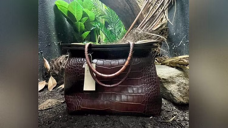 চিড়িয়াখানার কুমিরের খাঁচায় কুমিরের চামড়ার ব্যাগ